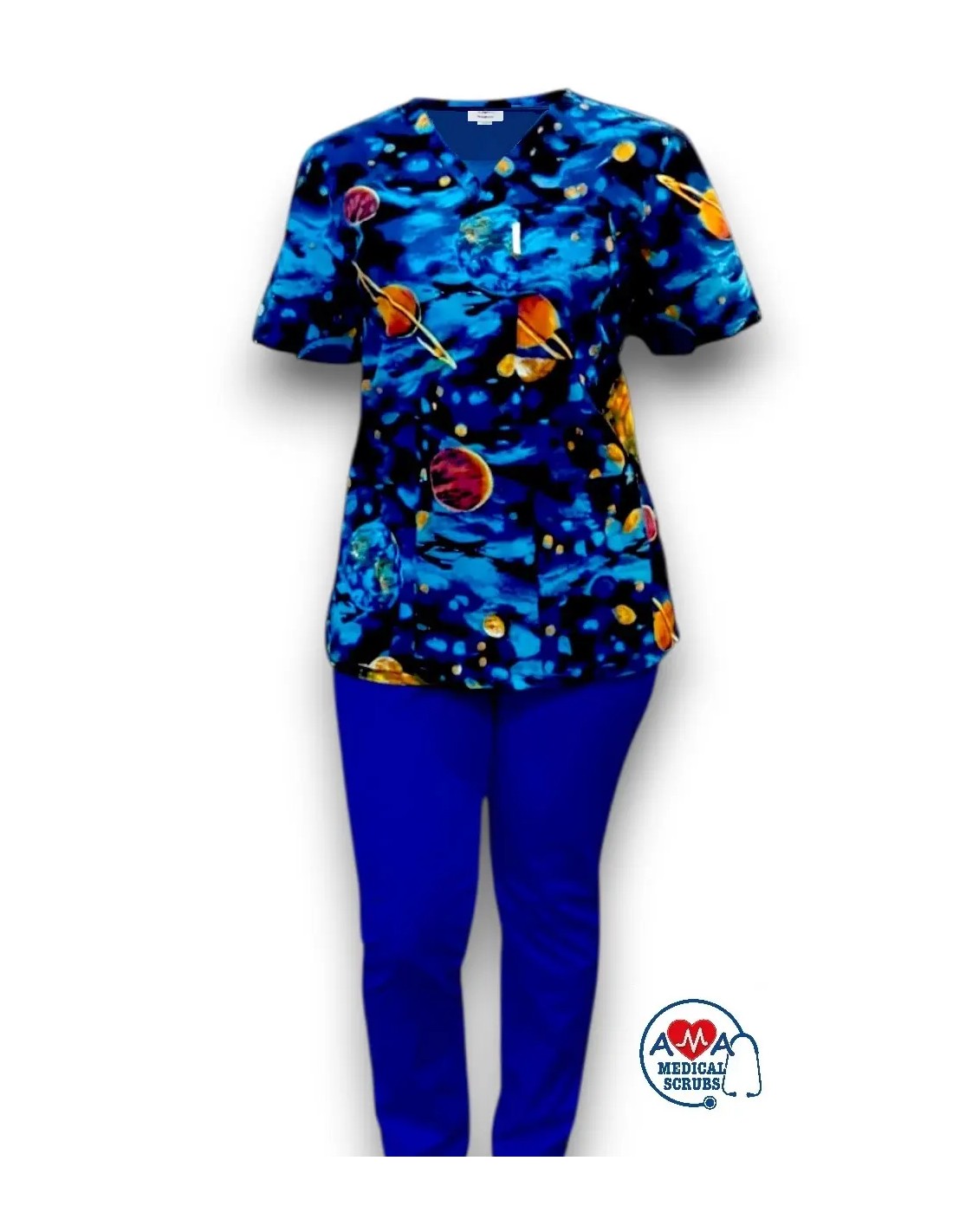 Transforma-ti ziua de lucru intr-o experienta plina de culoare si inspiratie cu bluza medicala Stellarium – disponibila acum pe amamedicalscrubs.ro!