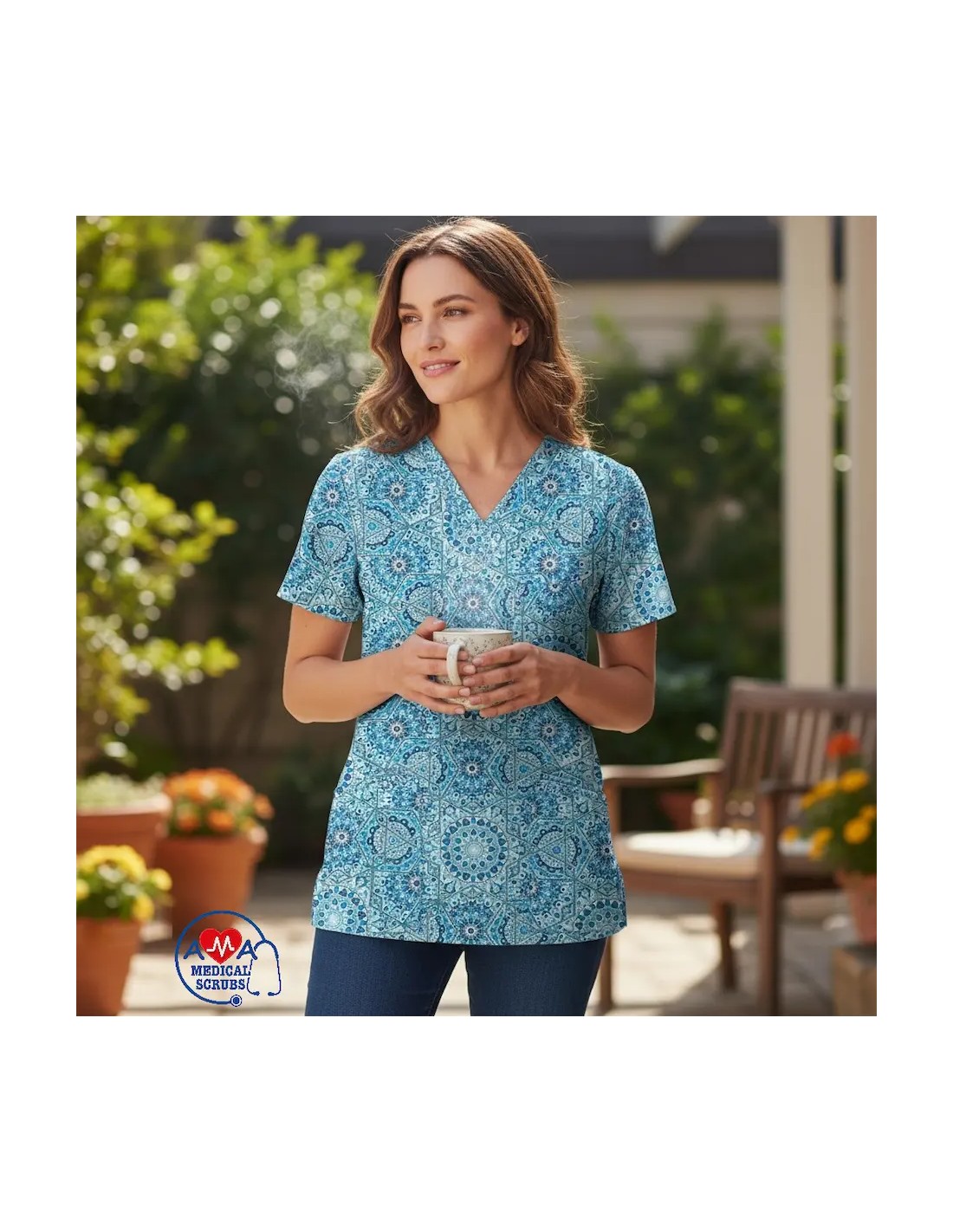 Un imprimeu sofisticat si eleganta practica se intalnesc in bluza medicala Blue India – disponibila acum pe amamedicalscrubs.ro!