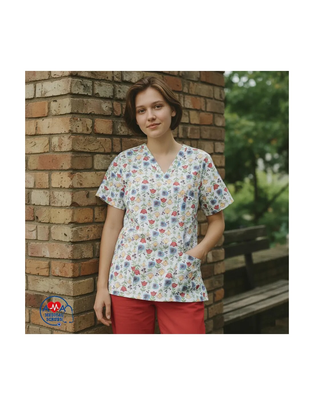 Un imprimeu plin de culoare si functionalitatea unei bluze medicale cu anchior se intalnesc in modelul Flowers – disponibil acum pe amamedicalscrubs.ro!