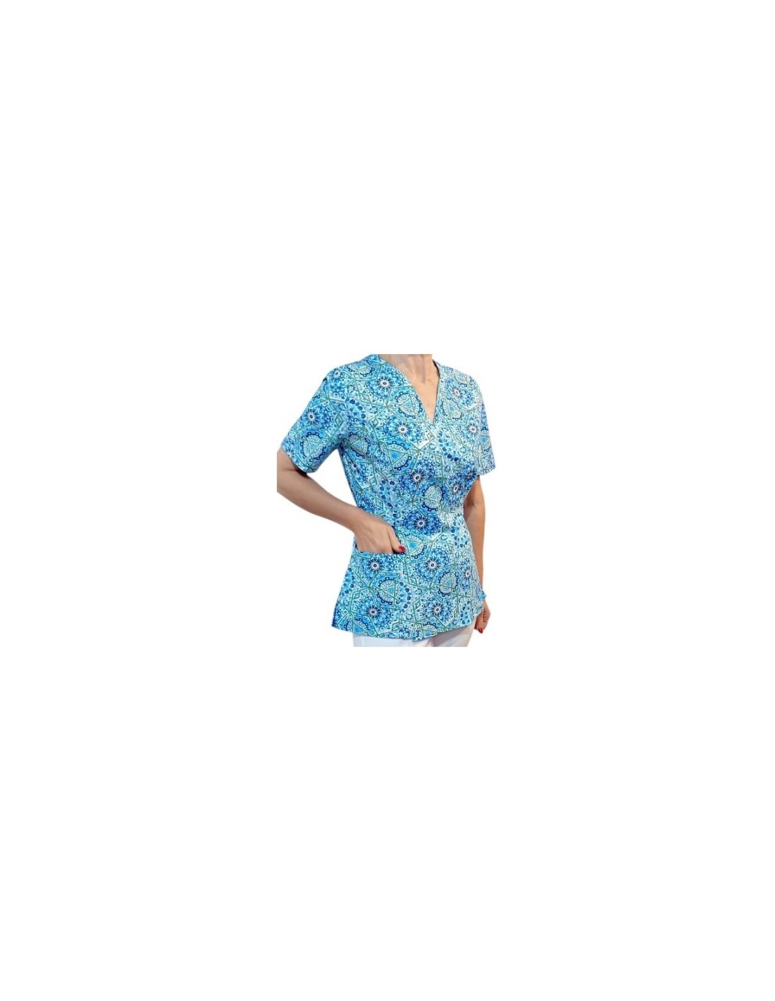 Halatul medical tip kimono BLUE INDIA confectionat din bumbac 100% are doua buzunare aplicate, croiala moderna, cambrata, cu clini in partea frontala si spate.