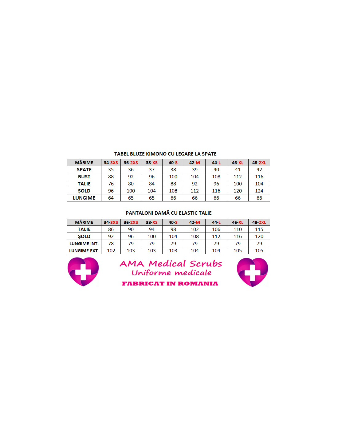 Costumul contine pantaloni medicali de dama ELASTICITY-FLEX (disponibili in site si individual) intr-o varietate de culori elegante si marimi diferite, pentru a se potrivi tuturor preferintelor si siluetelor. Astfel, fiecare profesionist medical poate gasi uniforma perfecta potrivita stilului sau personal si nevoilor sale.