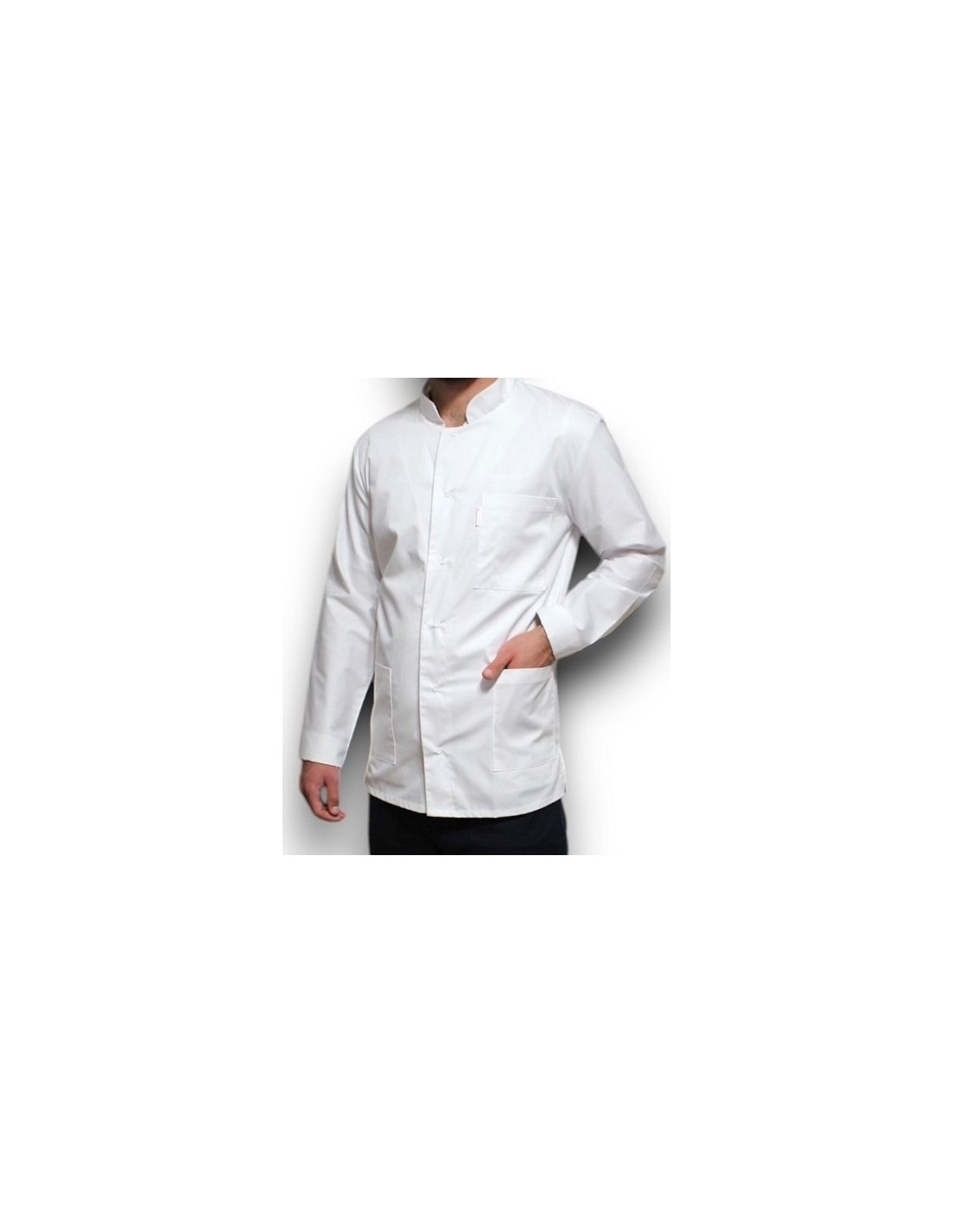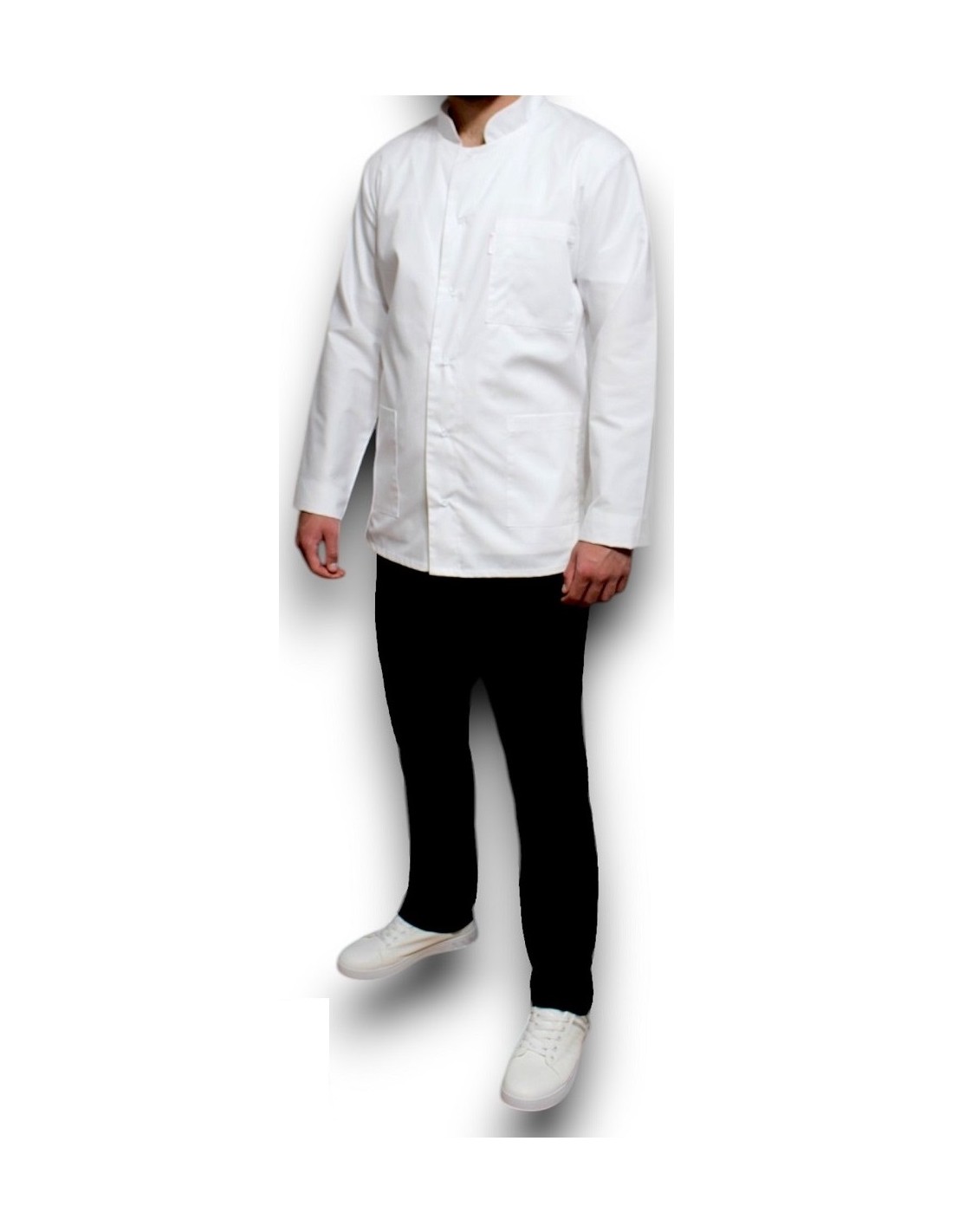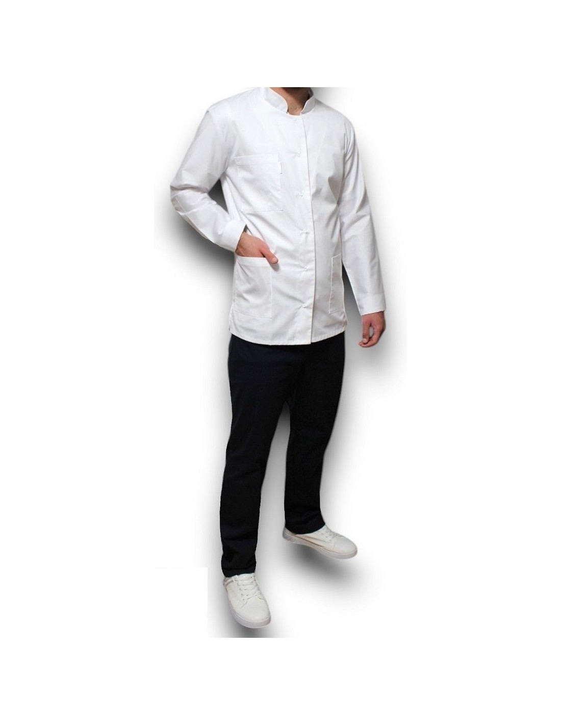 DocLine TUNIC-LM este lejer, lungime la nivelul soldului, are guler tip tunica, maneci lungi, trei buzunare aplicate, doua in partea inferioara si unul la piept, si inchidere cu capse din material inoxidabil.