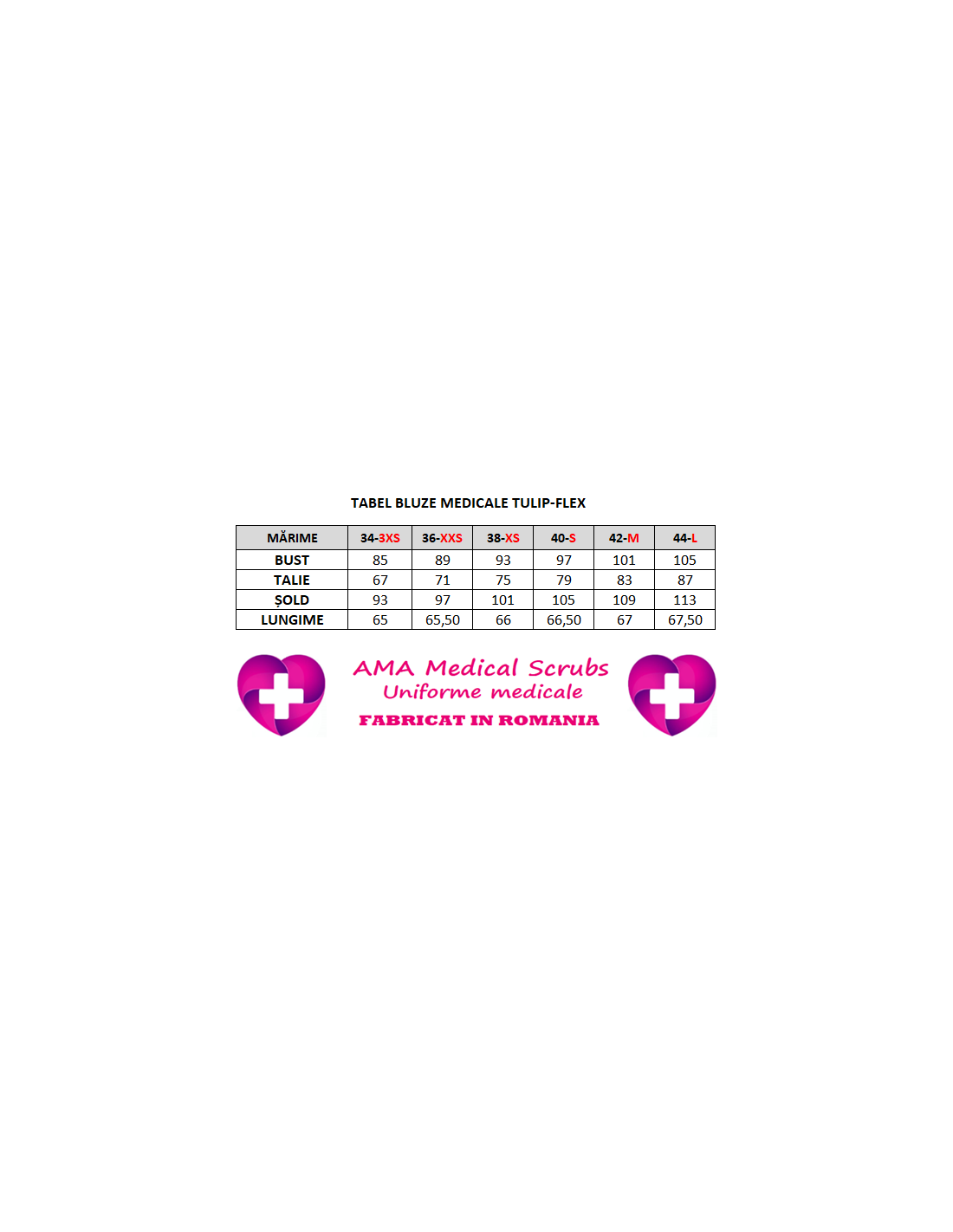 **Caracteristici suplimentare**: Halatul TULIP-FLEX FLOWERS-H poate fi personalizat prin inscriptionare brodata (logo, denumire spital, nume cadru medical, titulatura, etc), respectand cerintele specifice fiecarui profesionist din domeniul medical.