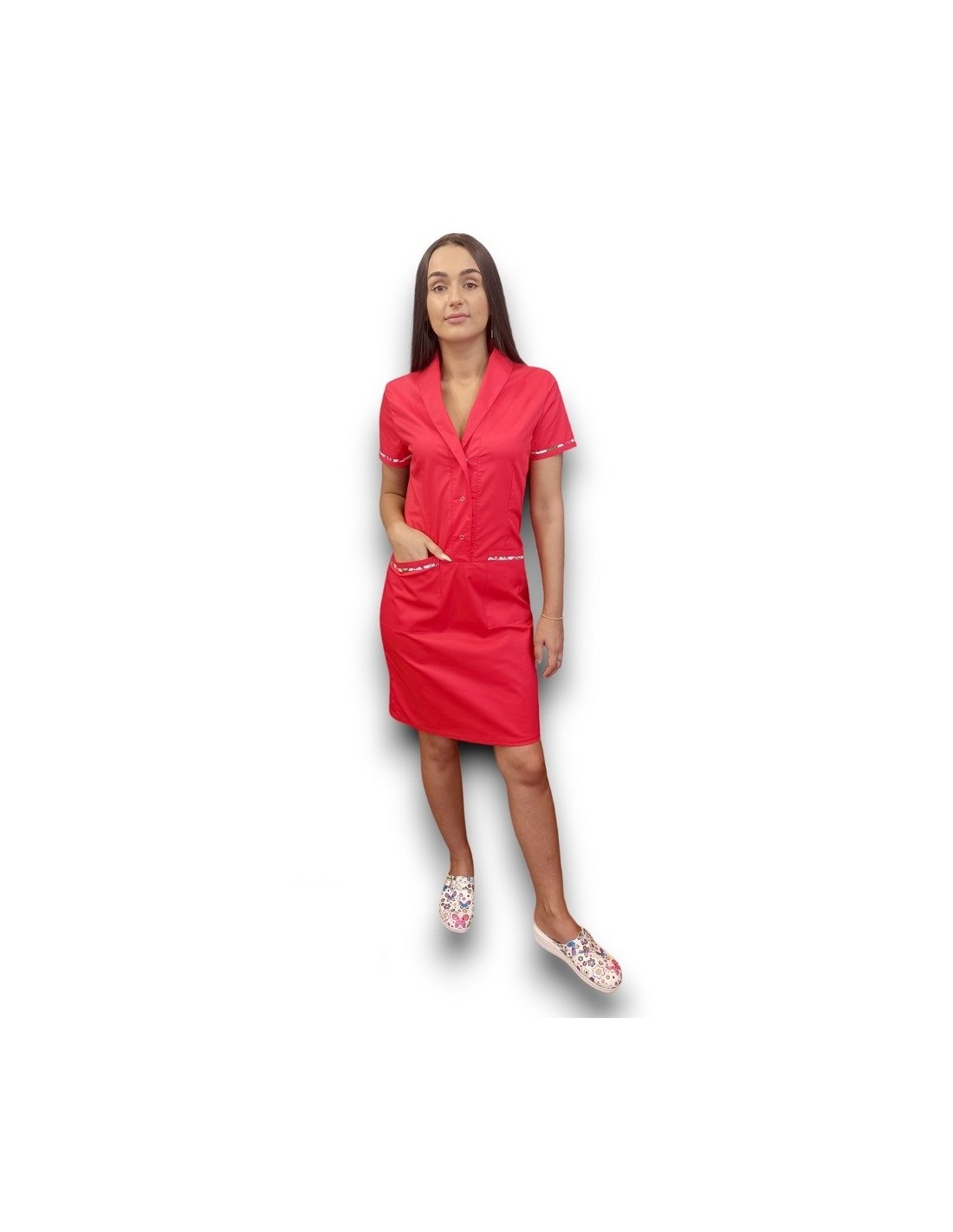 Sarafan medical rosu cu insertie florala, capse in fata, din tercot elastic